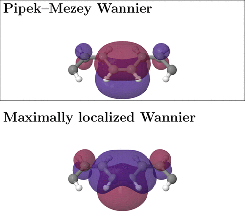The theory for the generation of Wannier functions within the generalized Pipek–Mezey approach (Lehtola, S.; Jónsson, H. J. Chem. Theory Comput.2014, 10, 642) is presented and an implementation thereof is described. Results are shown for systems with periodicity in one, two, and three dimensions as well as isolated molecules. The generalized Pipek–Mezey Wannier functions (PMWF) are highly localized orbitals consistent with chemical intuition where a distinction is maintained between σ- and π-orbitals. The PMWF method is compared with the so-called maximally localized Wannier functions (MLWFs) that are frequently used for the analysis of condensed matter calculations. Whereas PMWFs maximize the localization criterion of Pipek and Mezey, MLWFs maximize that of Foster and Boys and have the disadvantage of mixing σ- and π-orbitals in many cases. The PMWF orbitals turn out to be as localized as the MLWF orbitals as evidenced by cross-comparison of the values of the PMWF and MLWF objective functions for the two types of orbitals. Our implementation in the atomic simulation environment (ASE) is compatible with various representations of the wave function, including real-space grids, plane waves, and linear combinations of atomic orbitals. The projector-augmented wave formalism for the representation of atomic core electrons is also supported. Results of calculations with the GPAW software are described here, but our implementation can also use output from other electronic structure software such as ABINIT, NWChem, and VASP.